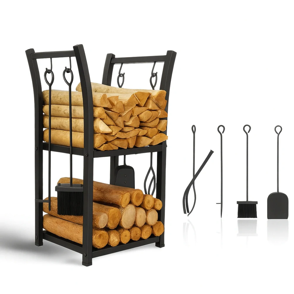 Obsah balenia: dvojposchodový stojan na drevo + 4 ks krbového náradia (pokrabáč, kliešte, metlička, lopatka)