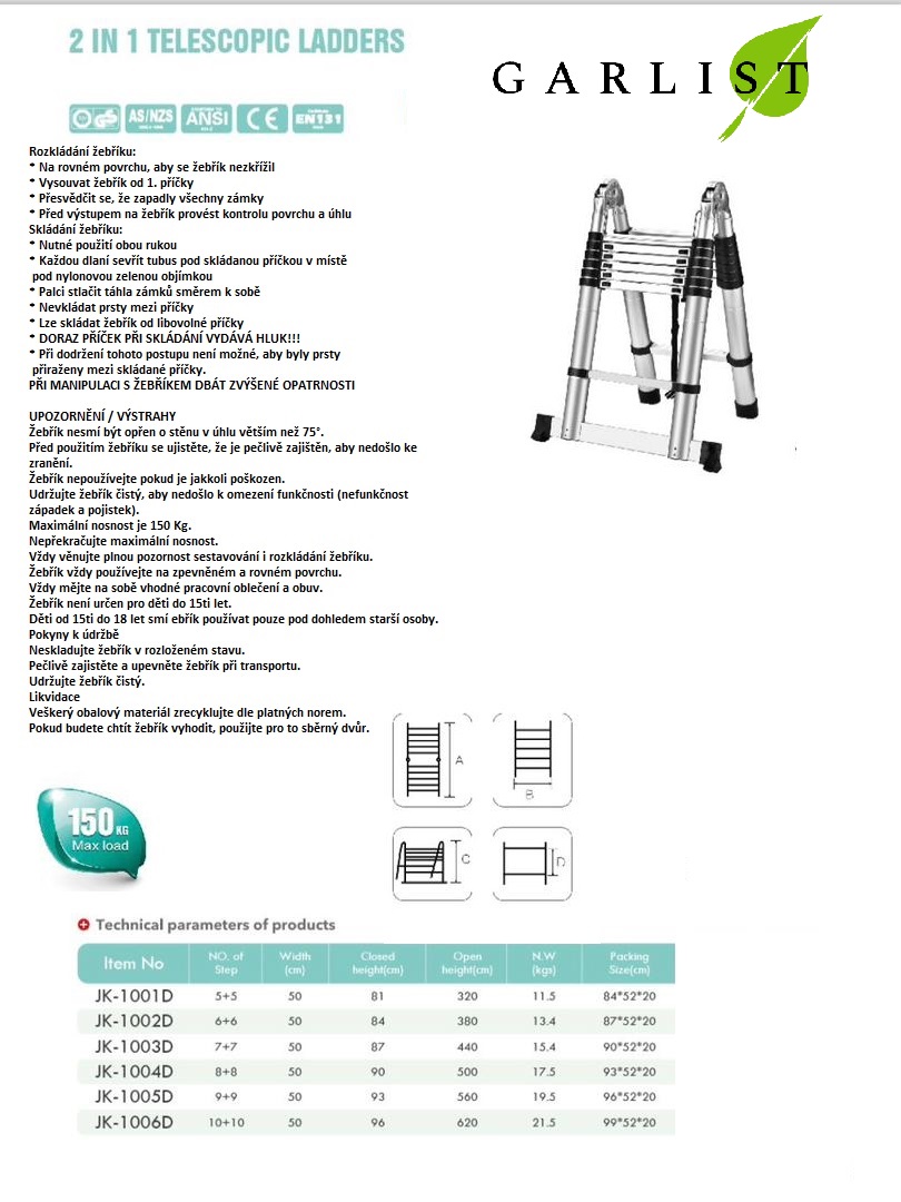 Teleskopický rebrík PROFI značky Garlist, používa vysoko kvalitnú hliníkovú zliatinu, hliníkovú povrchovú oxidačnú úpravu, ochranu proti korózii, opotrebeniu, starnutiu, odolnosť proti vysokým a nízkym teplotám, po mnohých testoch zaisťuje dlhú životnosť.