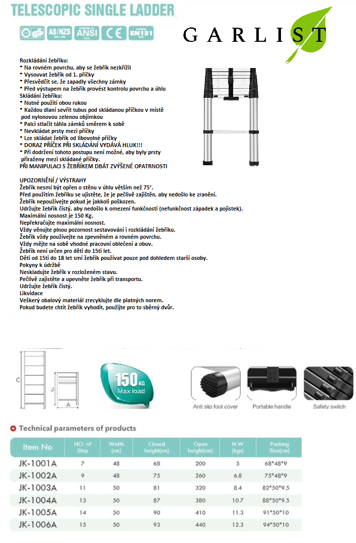 Teleskopický rebrík PROFI značky Garlist používa vysoko kvalitnú hliníkovú zliatinu, hliníkovú povrchovú oxidačnú úpravu, ochranu proti korózii, opotrebovaniu, starnutiu, odolnosť proti vysokým a nízkym teplotám, po mnohých testoch zaisťuje dlhú životnosť.