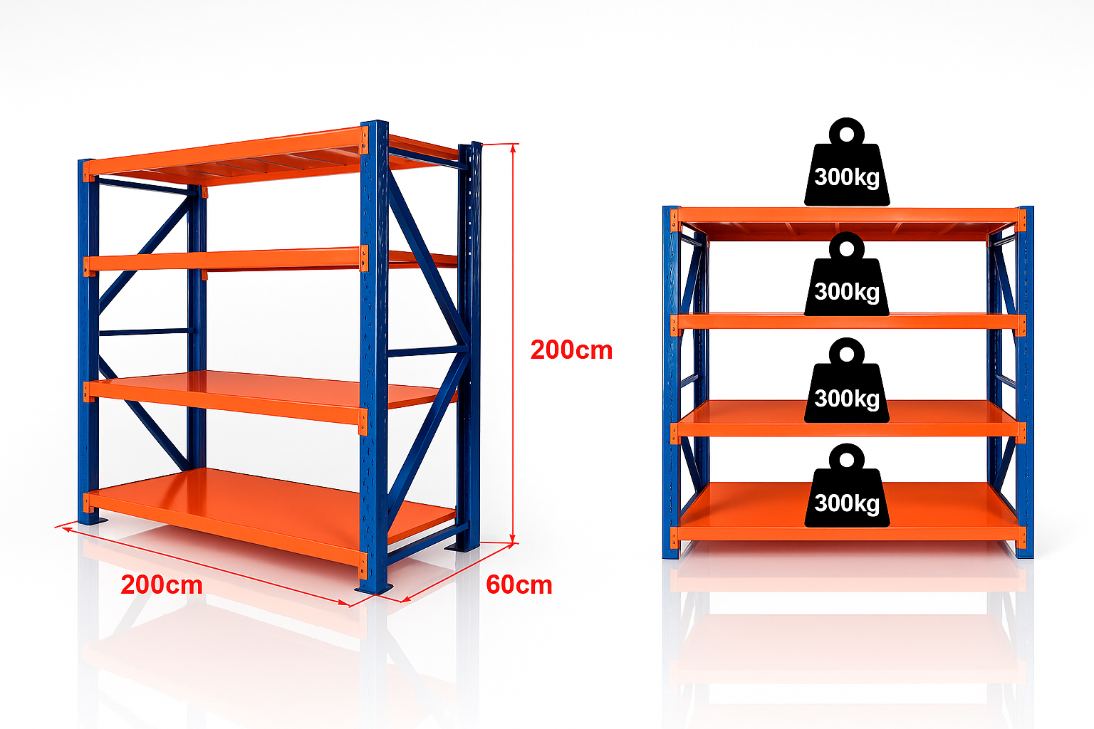 ✅ Nosnosť: až 1200 kg (300 kg/polica pri rovnomernom zaťažení)